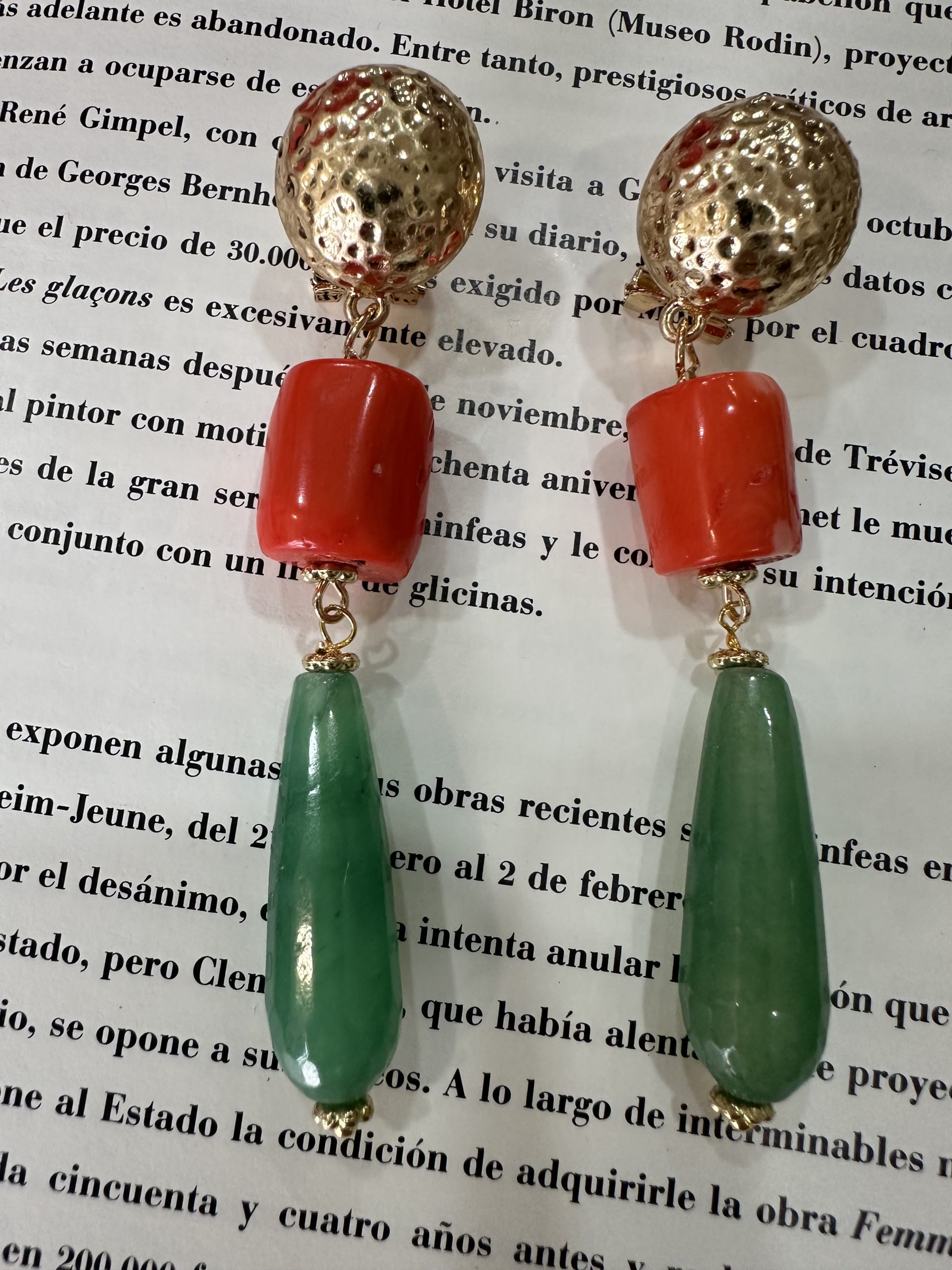 pendiente tubo coral,piedra lágrima color