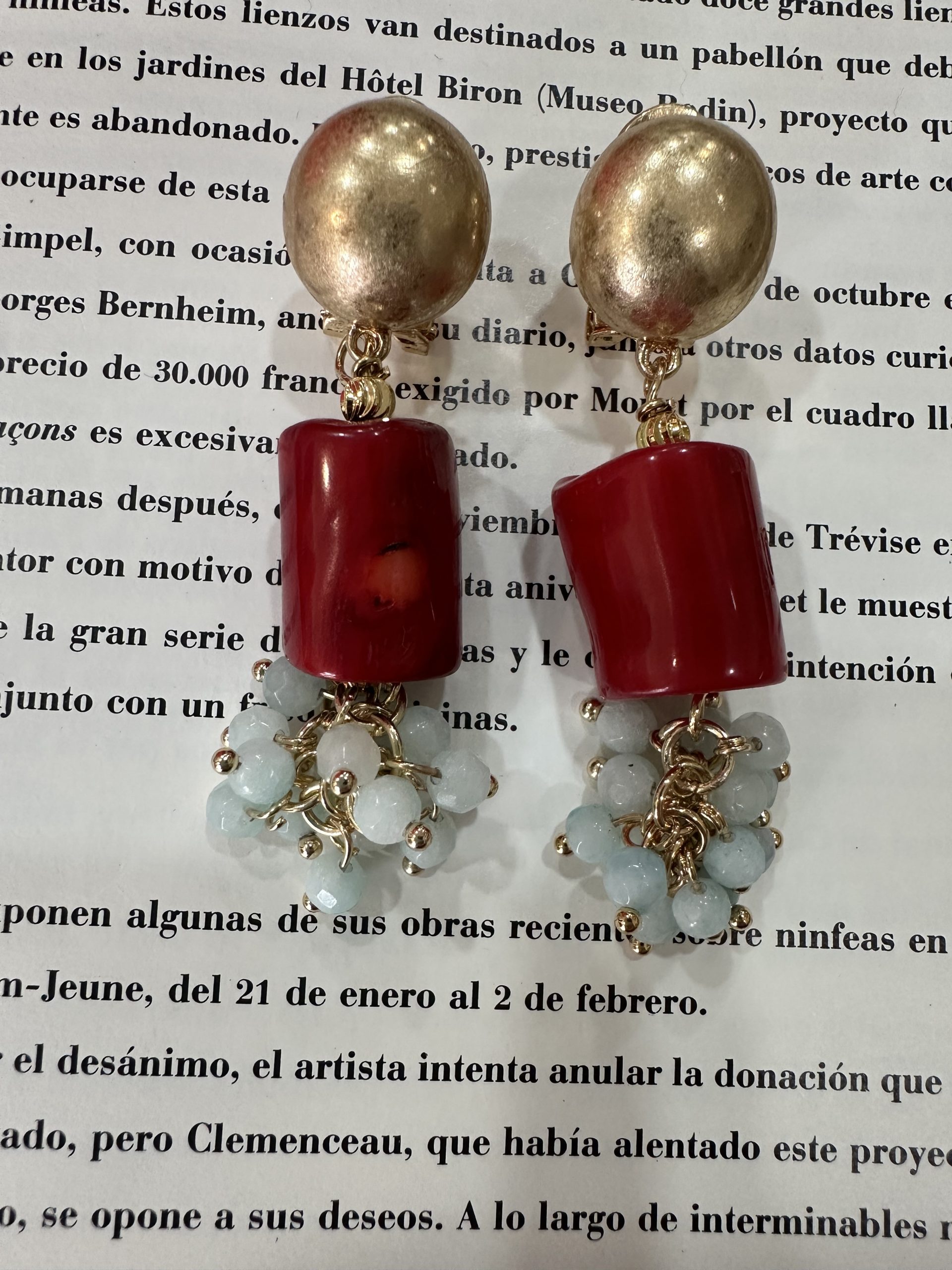 pendiente piedra tubo roja y racimo piedrecitas ,broche dorado
