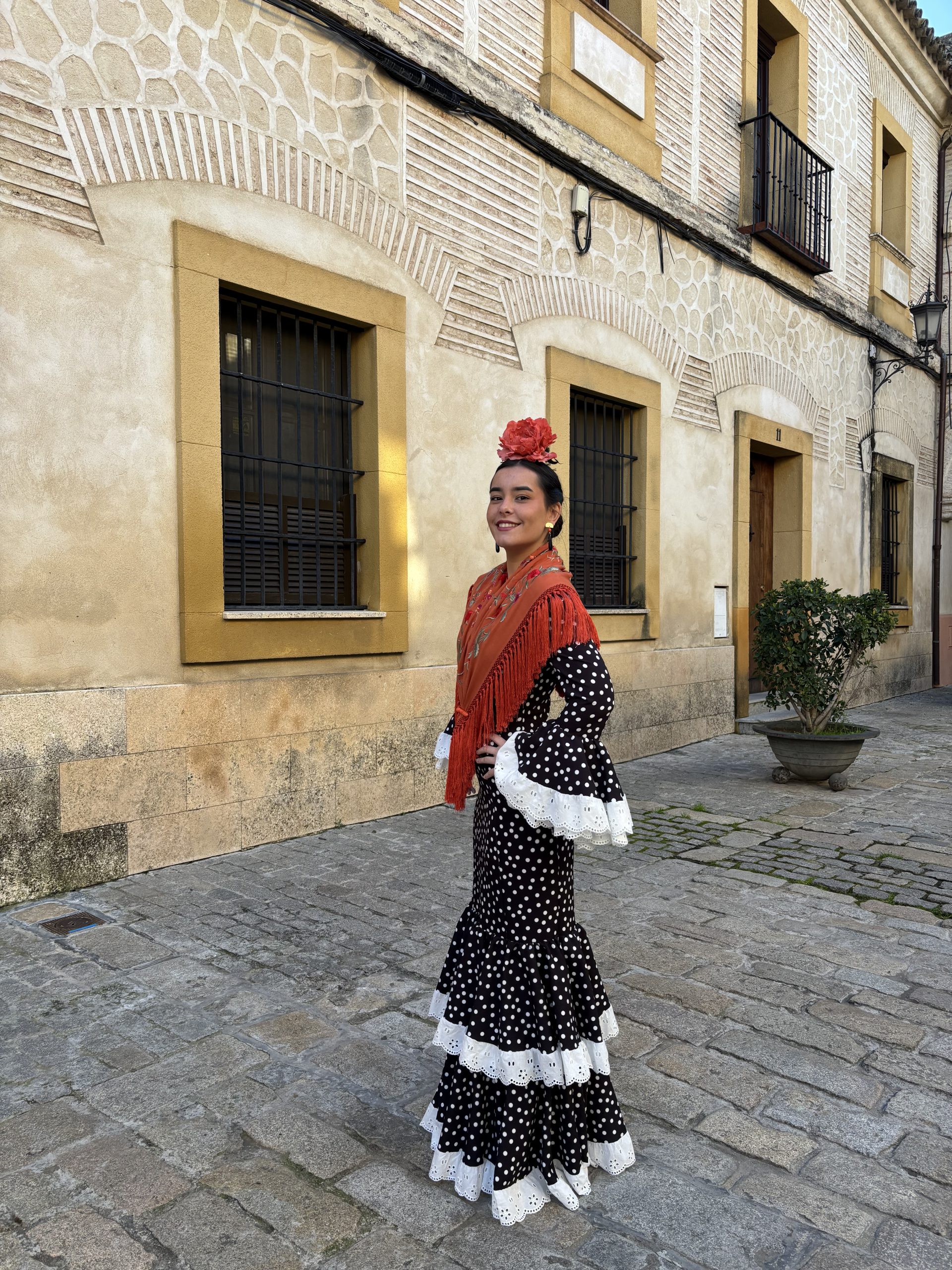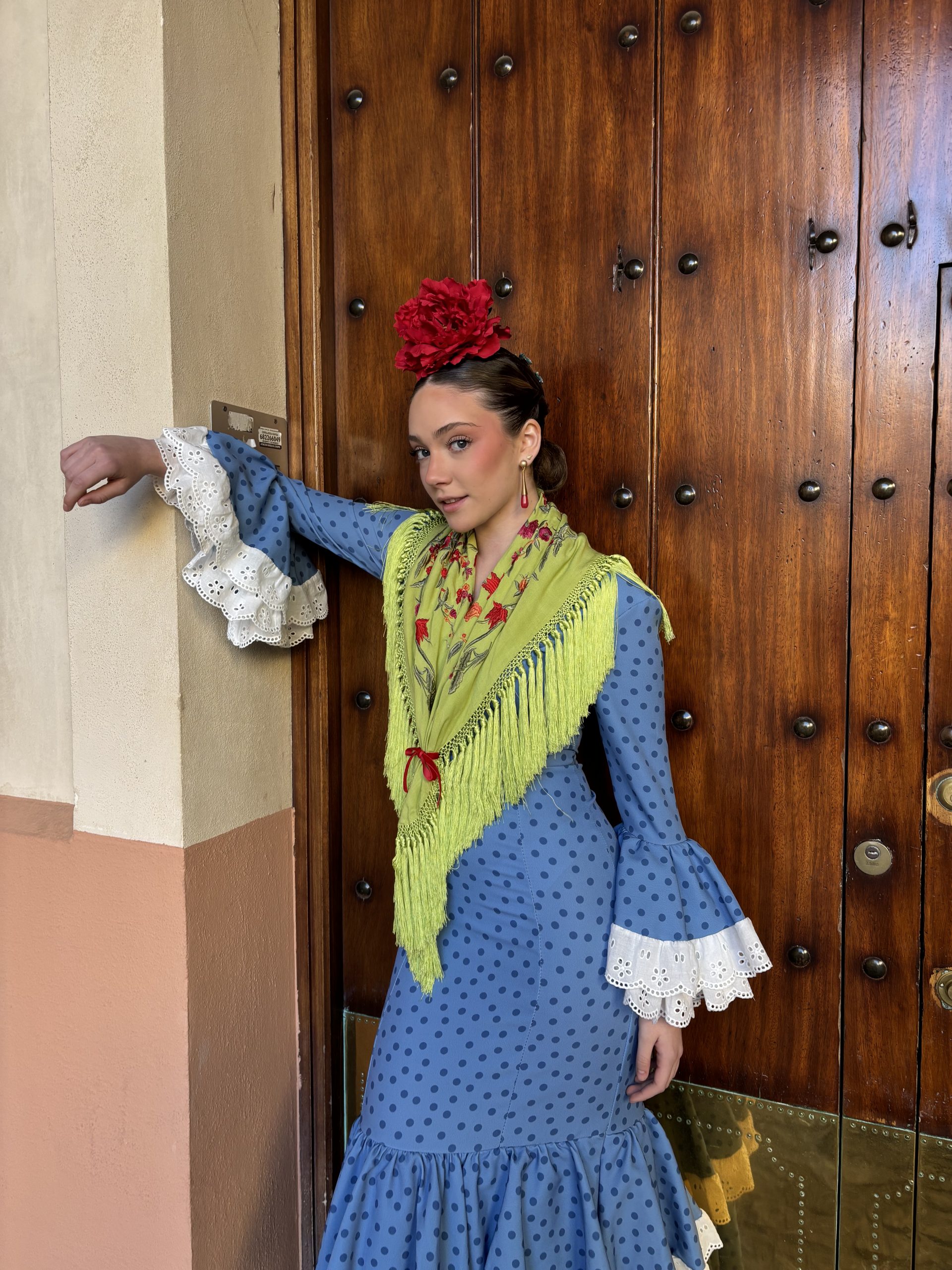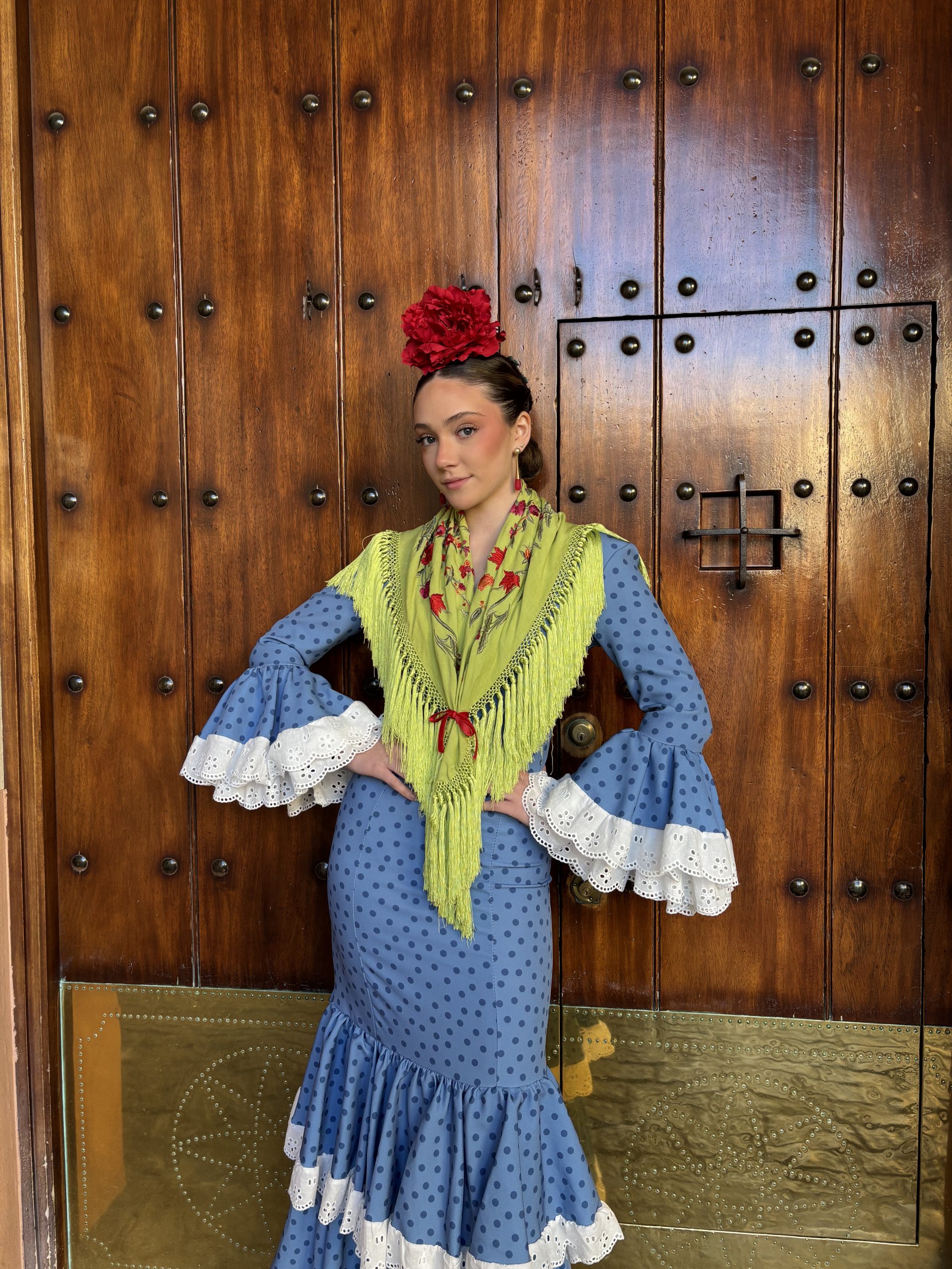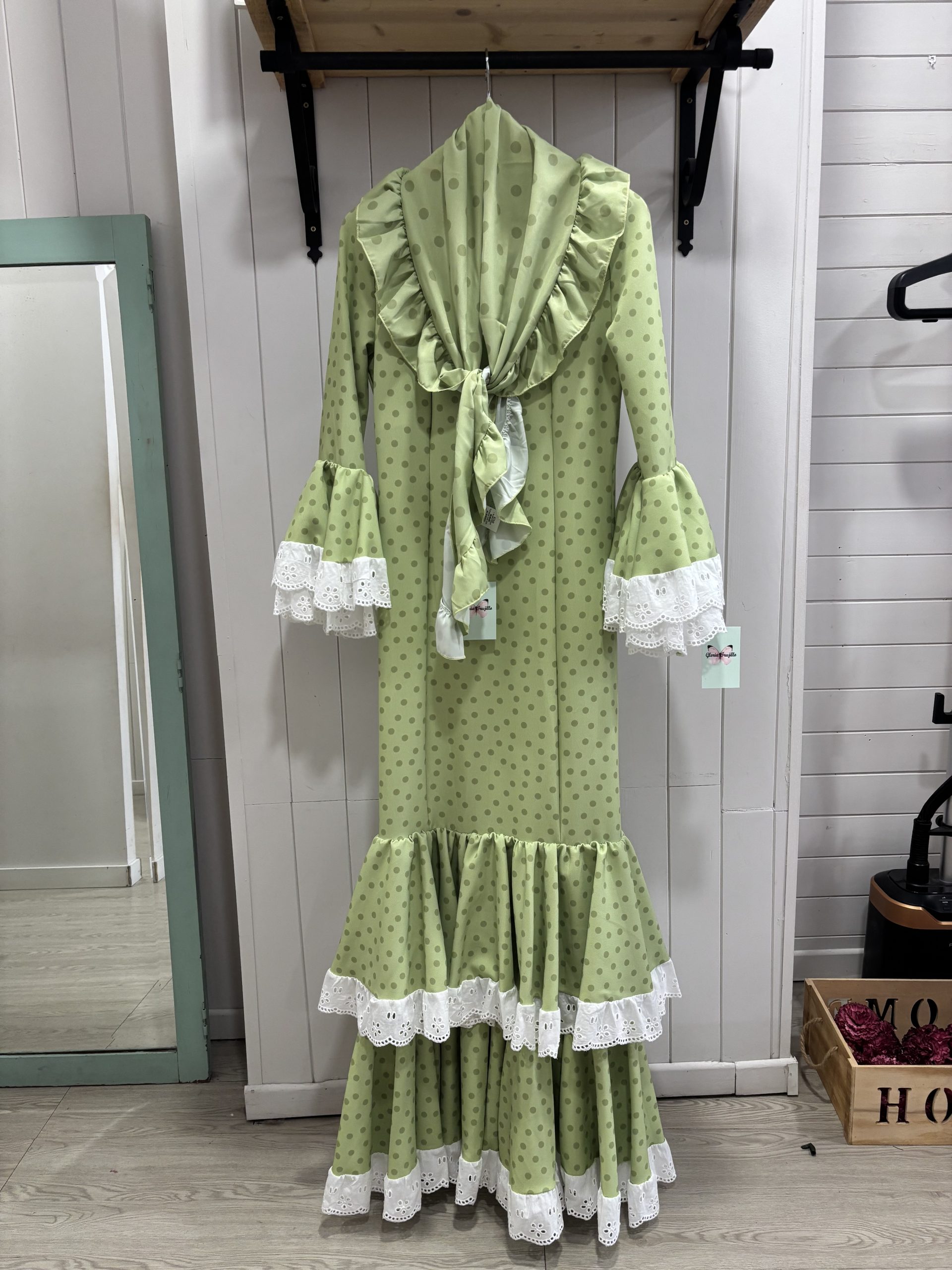 traje estampado lunar , tejido poliester, detalle blonda, disponible de xs a xxl ( pedidos al número : 955 22 55 31, horario 10.00 a 2.00 y 5.30 a 8.30)