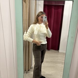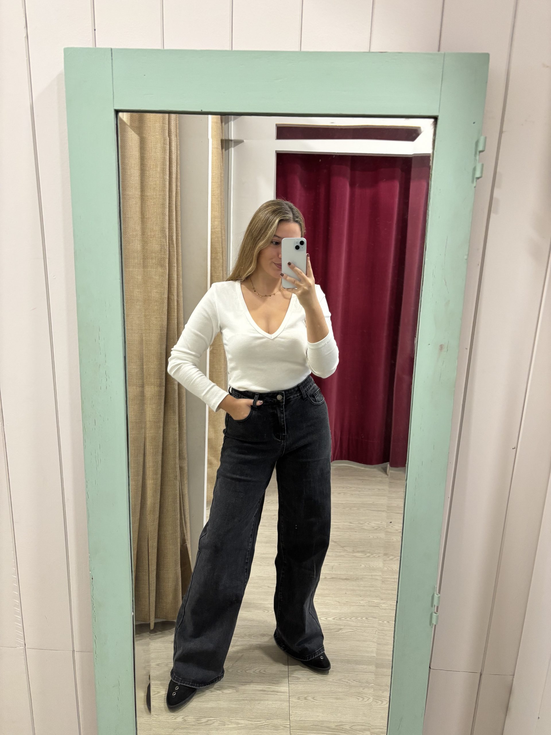 vaquero palazzo , detalle estrella , bolsillo trasero