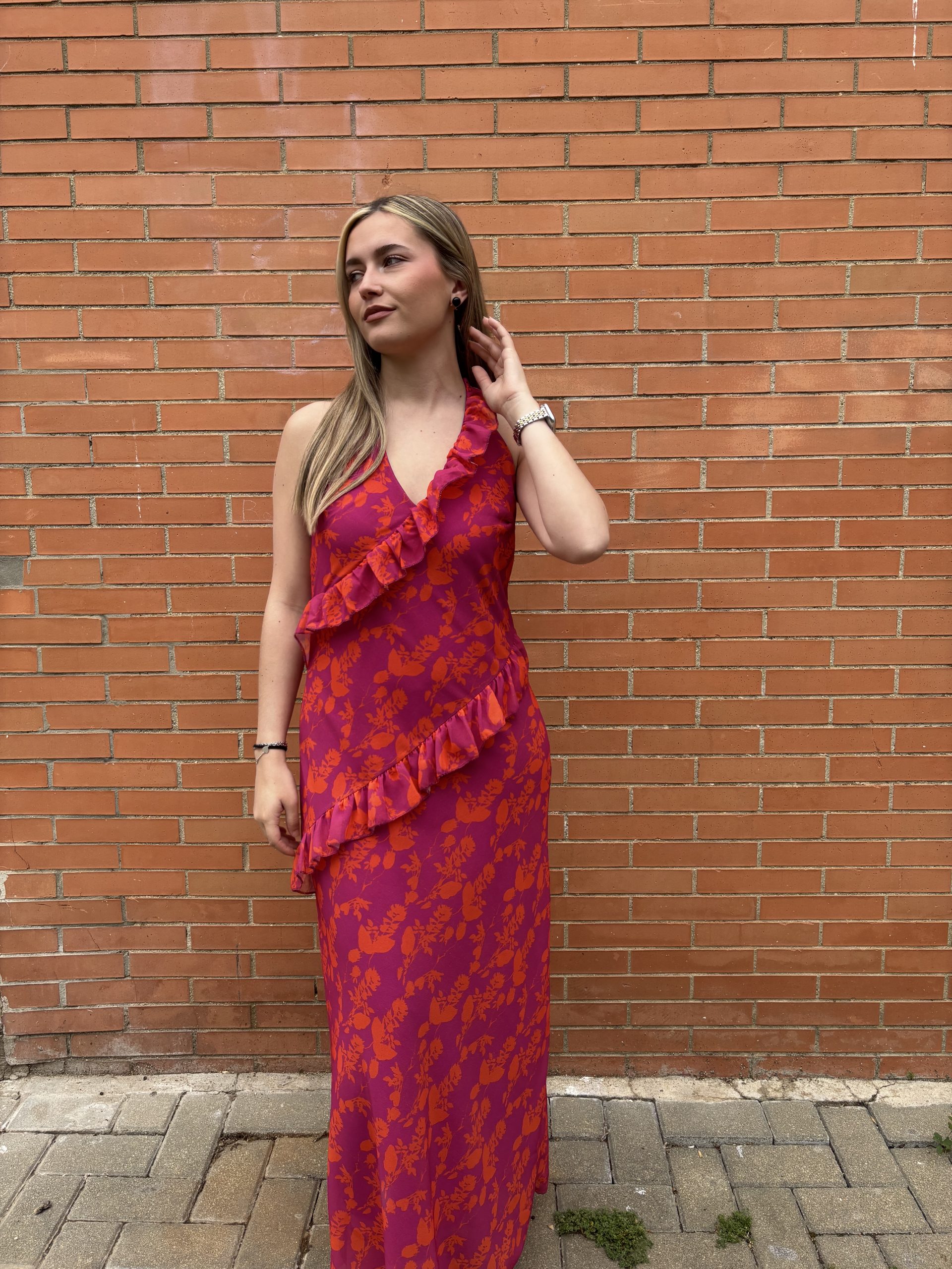 Vestido con la espalda descubierta con volantes. Talla única válido para 36/38.